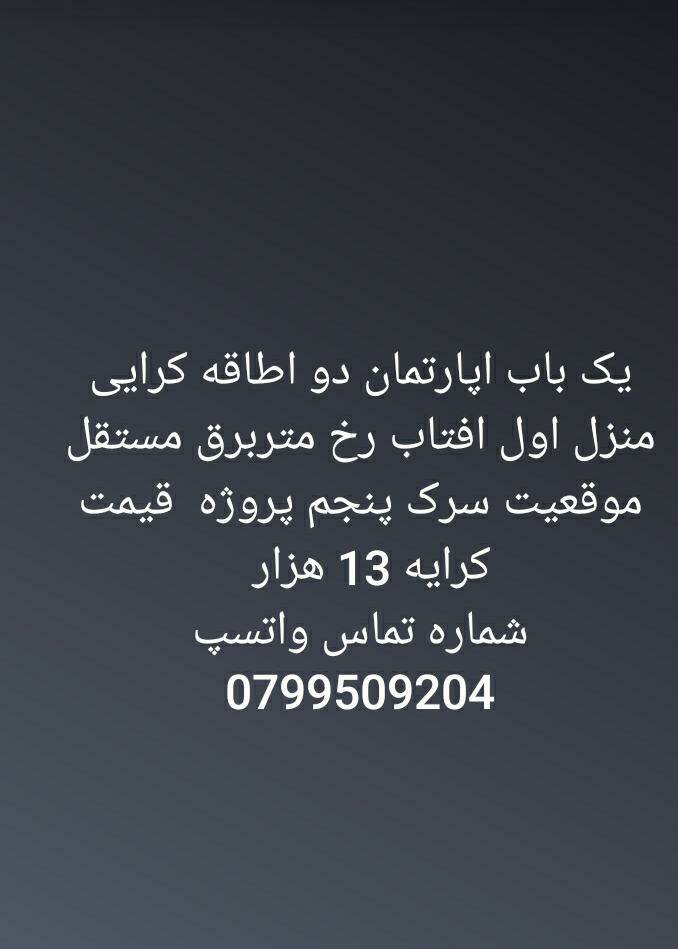 یک اپارتمان دو اطاقه کرایی منزل اول آفتاب رخ متر برق مستقل موقعیت سرک پنجم پروژه قیمت کرایه 13 هزار شماره واتسپ 0799509204